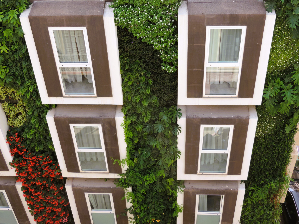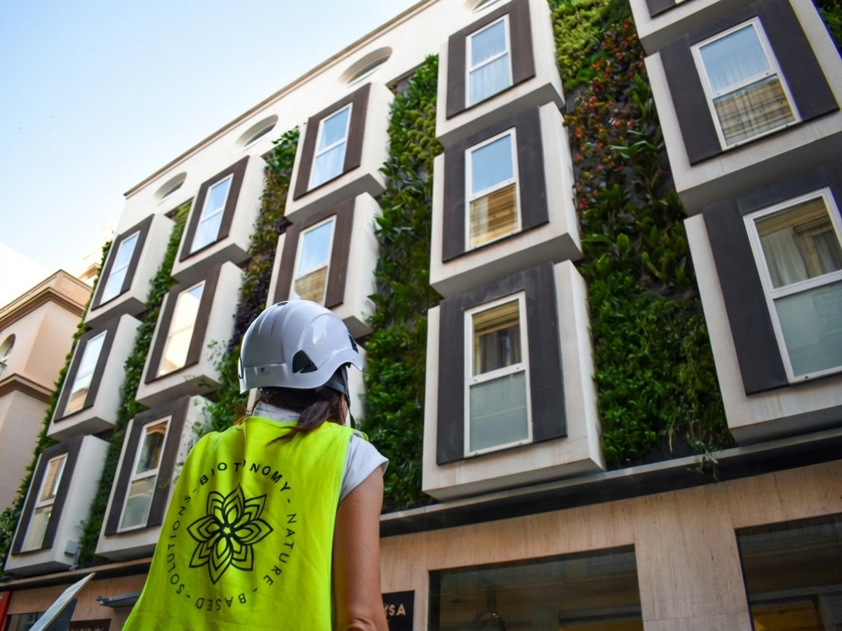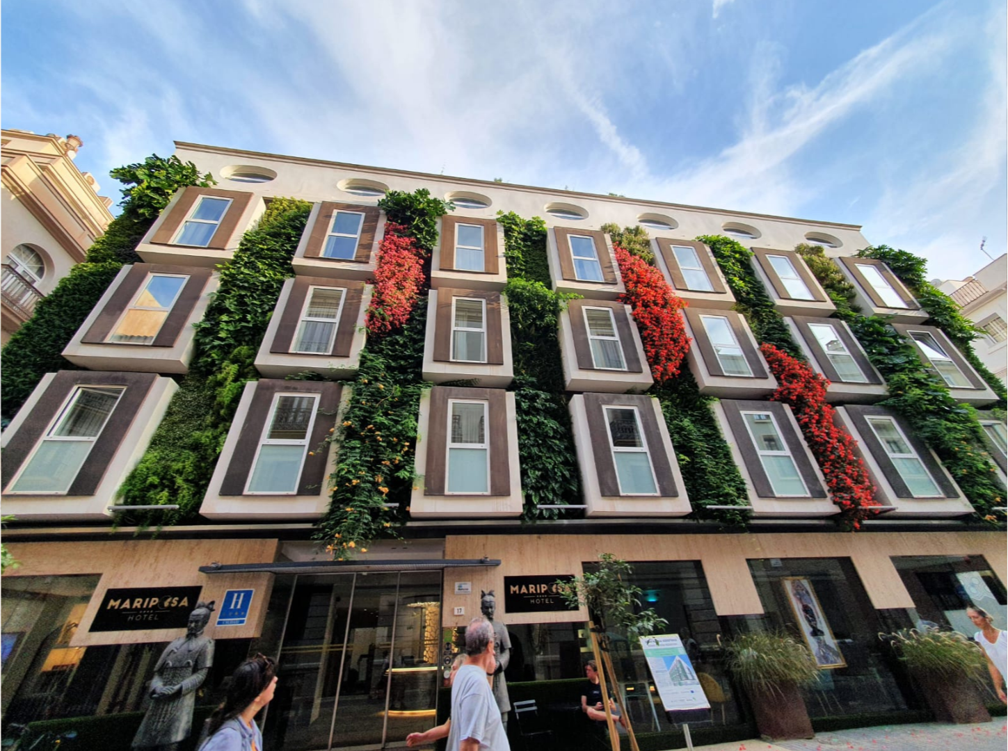 A real hotel project in Málaga where the building treats and reuses its own wastewater to irrigate an outdoor vertical garden — reducing water use and turning a waste problem into something useful.